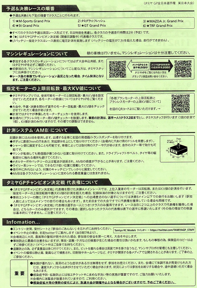 緑の紙裏面にはレース前、後の車検の注意事項が書いてあります。レース前にはバッテリーチェックが行われます。LFバッテリーなら上限の電圧は7.3V!こちらは走行前にチェックがあります。その後、ポンダーを車に取り付けてレース前の準備完了です。レース後に上位者には細かい車検があります。モーターの回転数が上限回転数以内か、オプションパーツは正しく取り付けられているかのチェックが入ってレース結果が確定します。