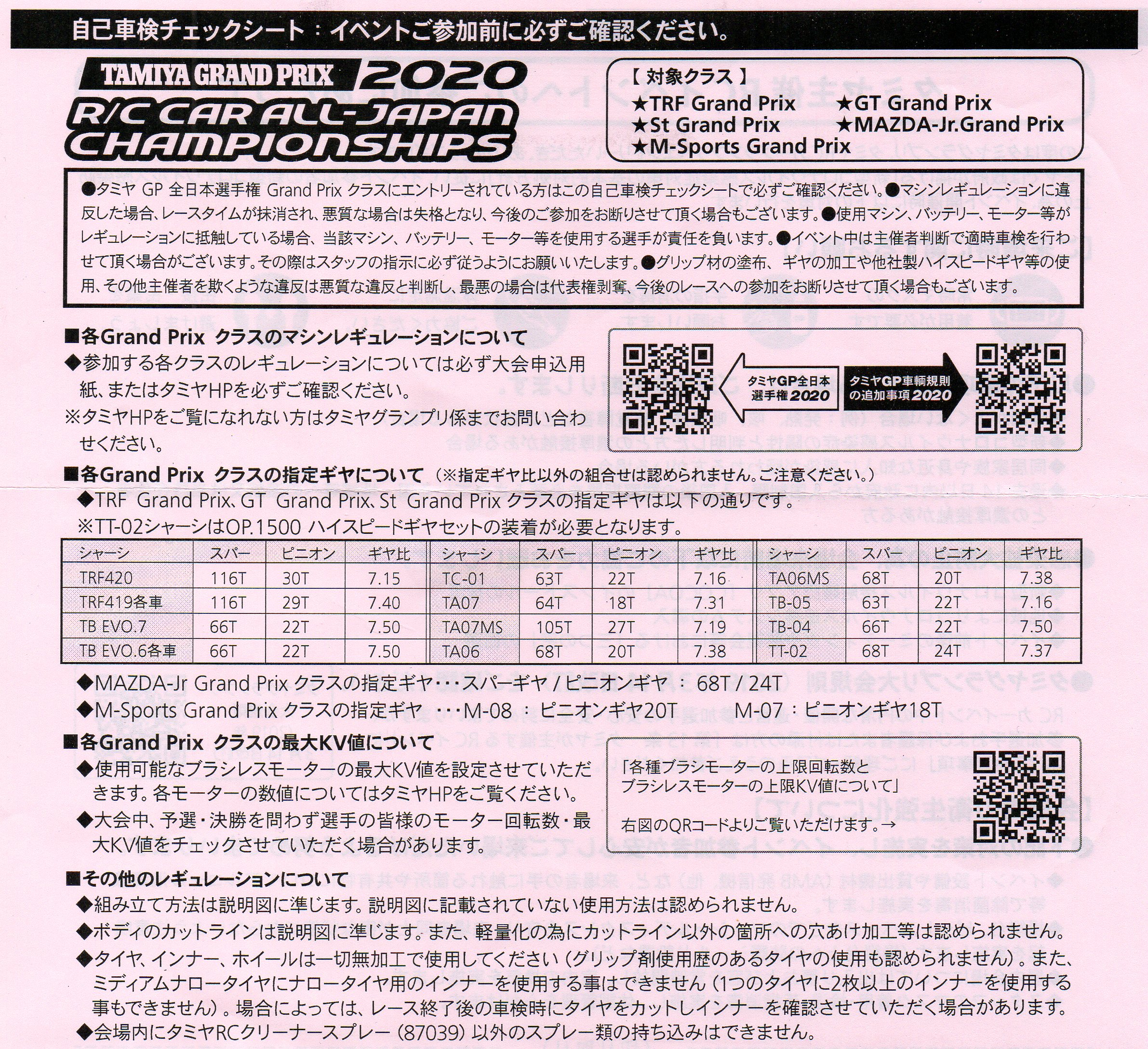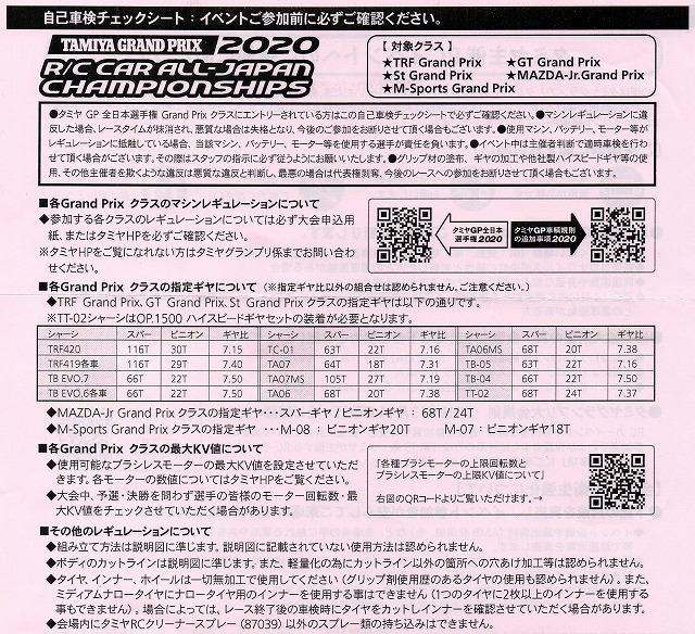 ピンク色の紙には、当日受付で提出する書面がついています。こちらに自分が参加するクラスを記載して受付で提出します。レース後にスキャンしたので切り取った部分がなくなっていますが…(汗 その他レギュレーションの案内が書いてあります。