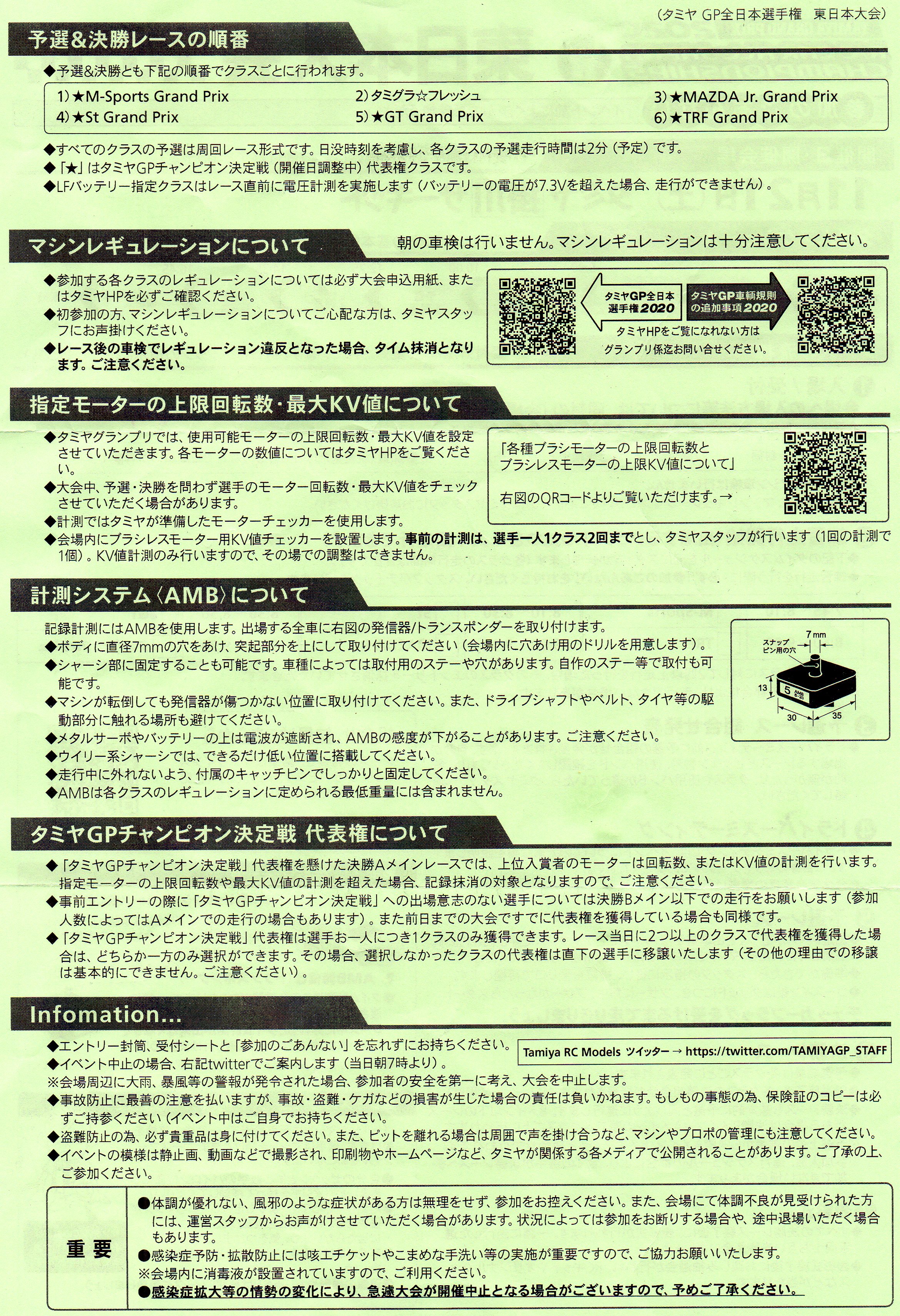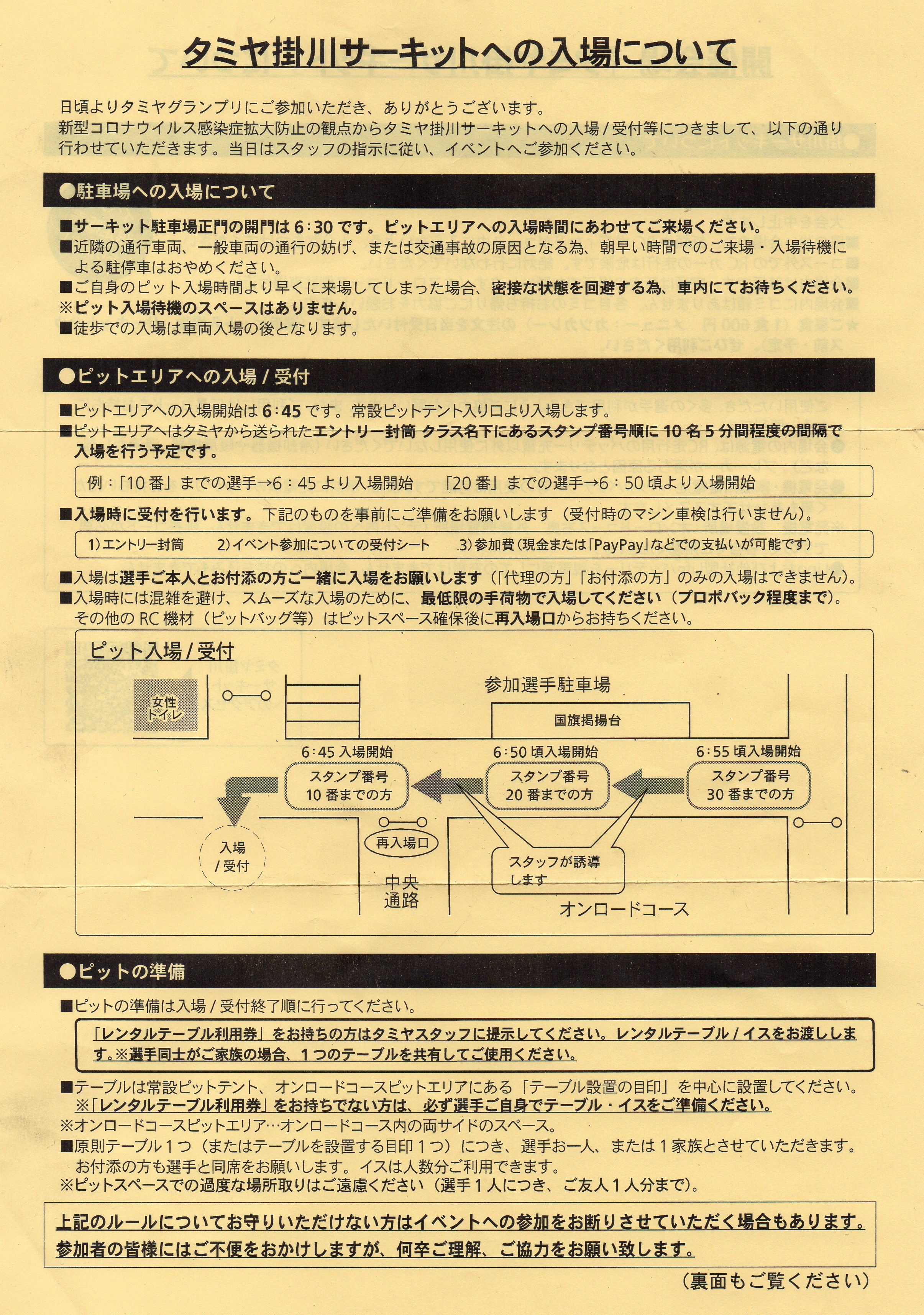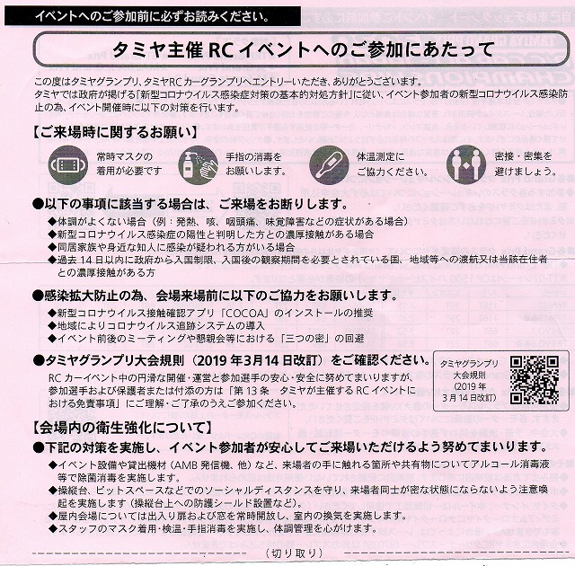 裏面には新型コロナウイルス対策の案内が記されています。入場の際にもタミヤスタッフさんがアルコールを手にかけてくれたり、マスクの案内等をしてくれています。