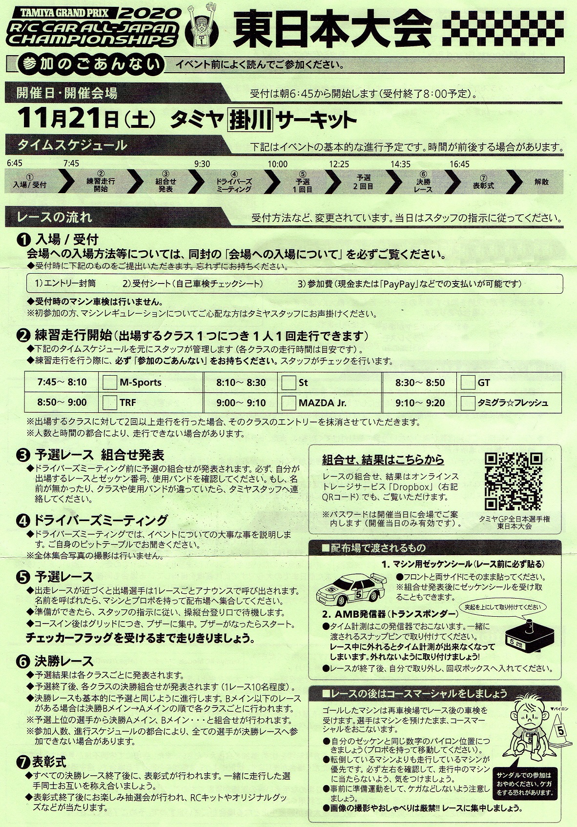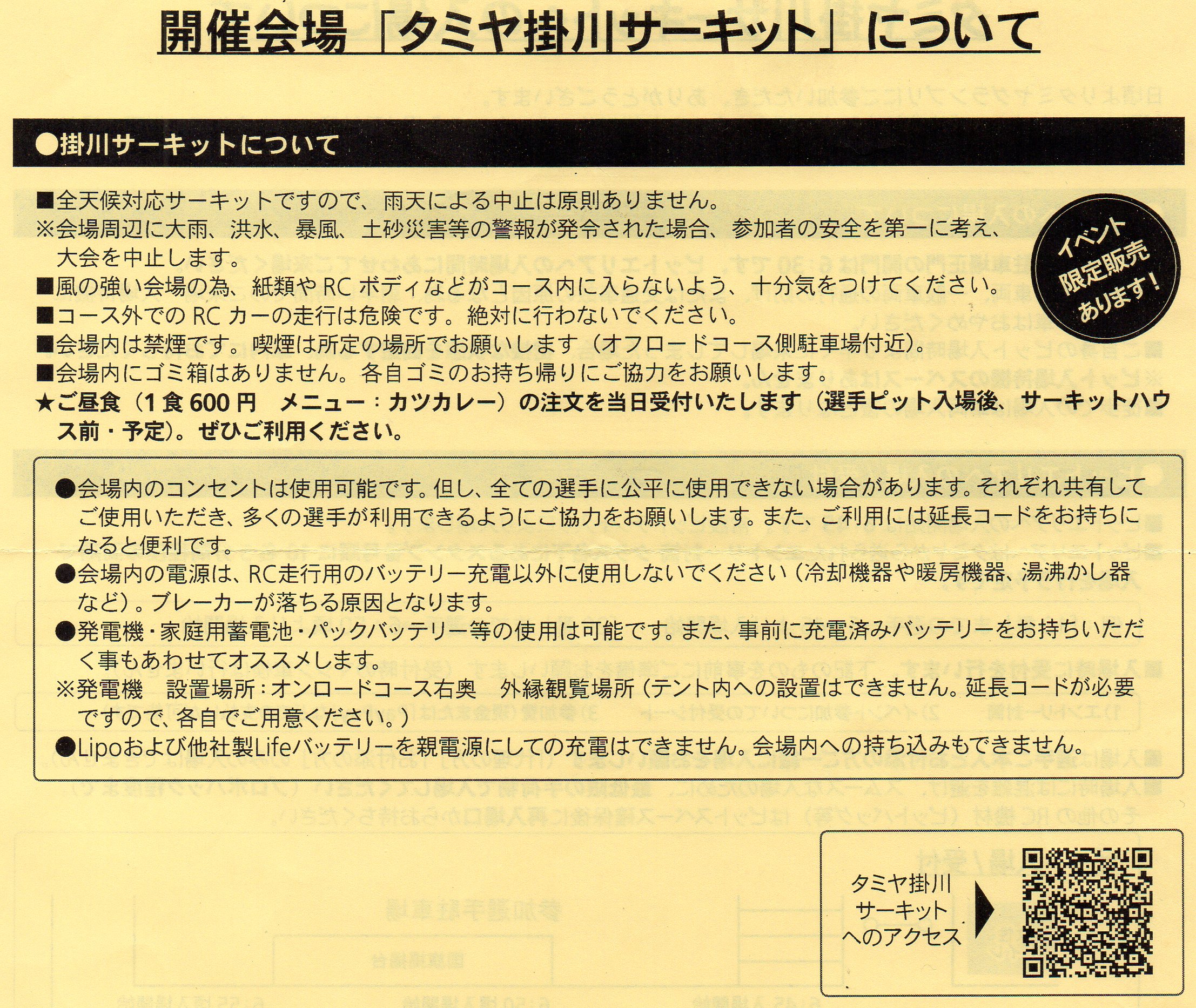 エントリーが出来た方は、上記の様な案内が郵送で送られてきます。はじめてレースに参加するのはドキドキするでしょうが一度参加してしまえば、エントリーのドキドキはなくなります。少しでもレース参加の敷居が下がると嬉しいです。また、マシンをまだ持っていない方でも、タミヤグランプリの見学は可能です。入場の際に検温等ありますが、もちろん入場無料です。入場すれば間近でレースを見学することもできますし、タミヤグランプリ限定のアイテムを購入することも可能です。レースの雰囲気を味わうだけでも、とっても楽しいですよw是非、タミヤ掛川サーキットにお越しください!